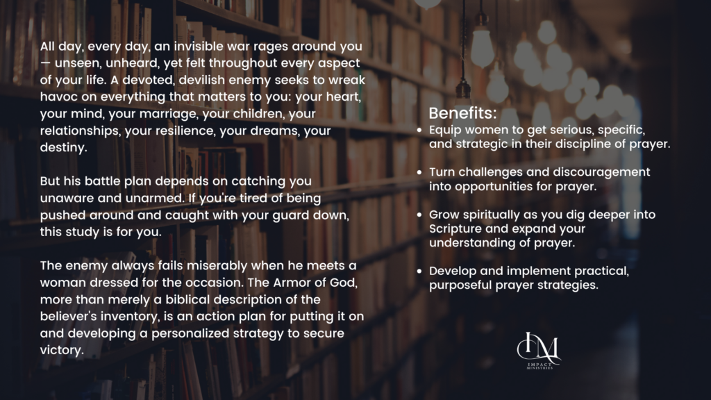The enemy always fails miserably when he meets a woman dressed for the occasion. The Armor of God, more than merely a biblical description of the believer’s inventory, is an action plan for putting it on and developing a personalized strategy to secure victory.